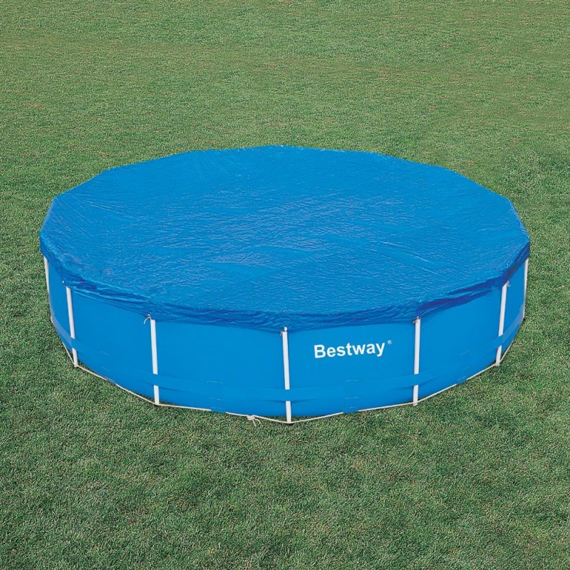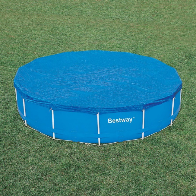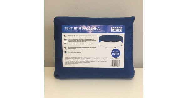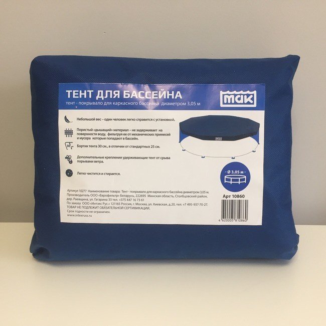 Тент предохраняет бассейн от попадания в него листвы, мусора, дождя. Ночью тент предохраняет от излишнего остывания и испарения воды. Размер тента позволяет укрыть бассейн диаметром 305 см, свес краев..