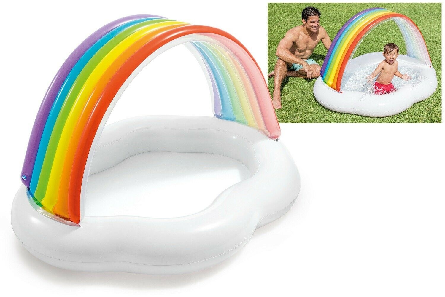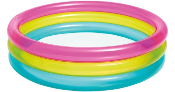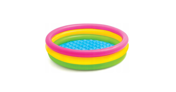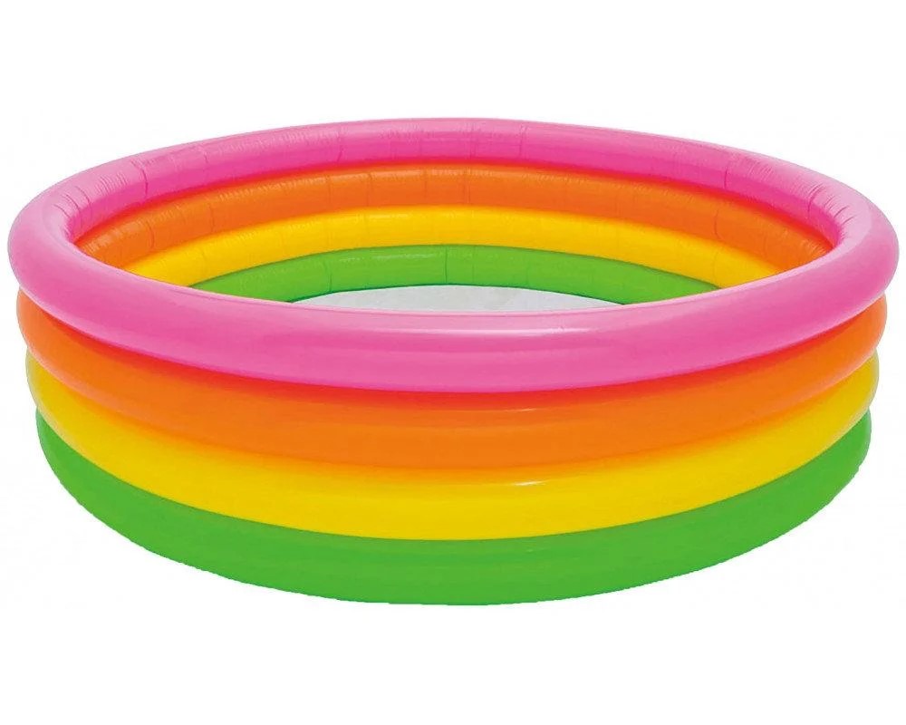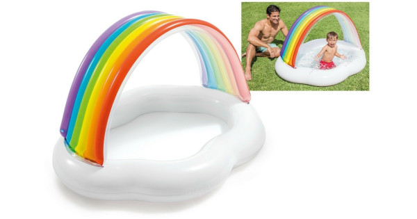 Надувной бассейн Intex 57156 подходит для детей в возрасте от 1 года. Подключив садовый шланг к бассейну, струи воды с края бассейна разбрызгиваются вверх. У бассейна есть теневая крыша в цветах радуг..